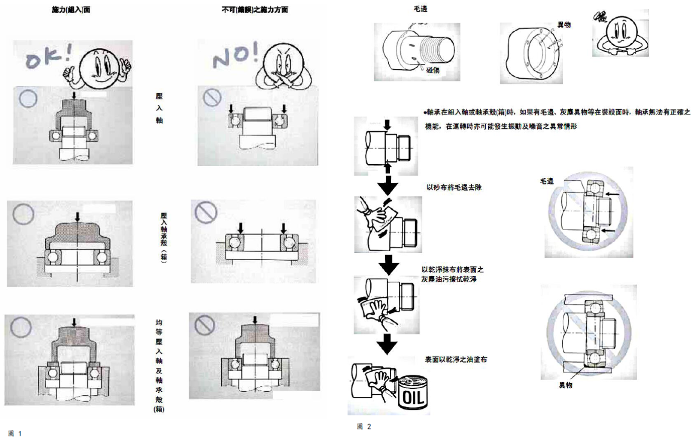 A clean and dry workplace must be provided for bearing installation. In particular, the assembly of ultra-small and ultra-small ball bearings will greatly affect the performance of the bearing if dust invades, so it should be carried out in a clean room, and the dimensional accuracy, shape accuracy and luminosity of the bearing installation part must be checked to confirm that these measurements are in Within the allowable tolerance. (1) Removal of burrs, bumps, protrusions, rust marks, oil stains, etc. on the mating surface of the shaft and bearing shell (box). In addition, a small portion of the end surface should be lubricated with oil, such as spindle oil (spindle oil) when inserted Easier. The operating procedure is shown in Figure 1. (2) Assembling tools, punches or presses, and other assembly tools, select the appropriate size to contact the bearing; the dirt, burrs, chips, etc. on the installation tools must be removed. (3) Bearings Bearings must be unpacked before installation. Also, the bearing is a high-precision product produced in a clean manufacturing process, please do not do any other processing, such as cleaning.