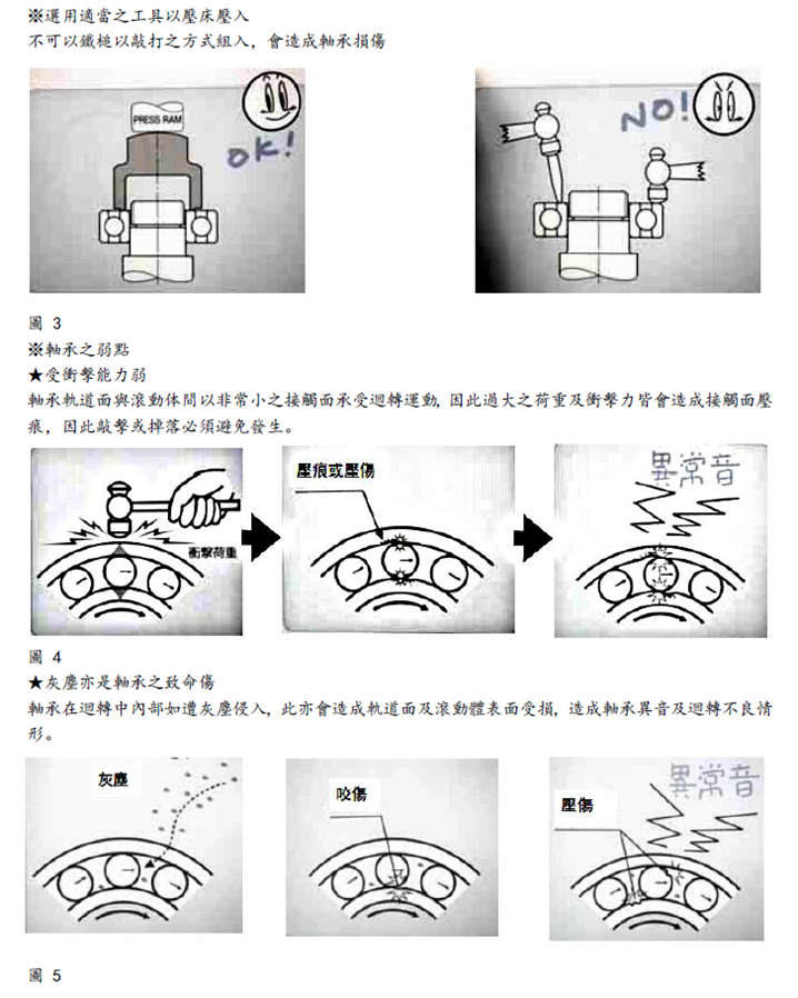 (1) Bearings with smaller tightness The assembly of bearings with smaller tightness can be roughly divided into press-in shafts, press-in bearing boxes, and evenly press-in shafts and bearing shells (boxes), as shown in Figure 2. The assembly method is to use a sleeve to press the end face of the track ring at room temperature, and press the bearing in by the sleeve, and the pressing force acts on the center of the bearing (when the bearing is to be installed on the shaft, force must be applied to the inner ring; the bearing should be installed on the bearing When housing (box), force must be applied to the outer ring), so that the entire circumference of the track ring is evenly pressed in; but if a large number of bearings are installed, the non-separable bearing of the hand press or hydraulic press must be installed in the shaft and the bearing shell at the same time When (box) is installed, press the inner and outer rings evenly into the shaft and bearing shell (box) with a shim. Other matters to be noted, such as not using an iron mallet to be beaten to cause damage and avoid dust intrusion, as shown in Figure 3. (2) When the tightness of the bearing inner ring is large or the shaft diameter is large, if you want to press the inner ring into the shaft at room temperature, you can use the heating mating group that heats the bearing to expand the inner ring before installation. Insertion method (the method of inserting the inner ring by heating and expanding). The required temperature difference between the inner ring and the mating surface is determined by the tightness and the diameter of the mating surface, and the relationship between the temperature difference of the inner diameter of the bearing and the amount of expansion is used. However, standard bearings cannot be heated to 120°C, and they cannot be used for grease-filled bearings and sealed bearings.